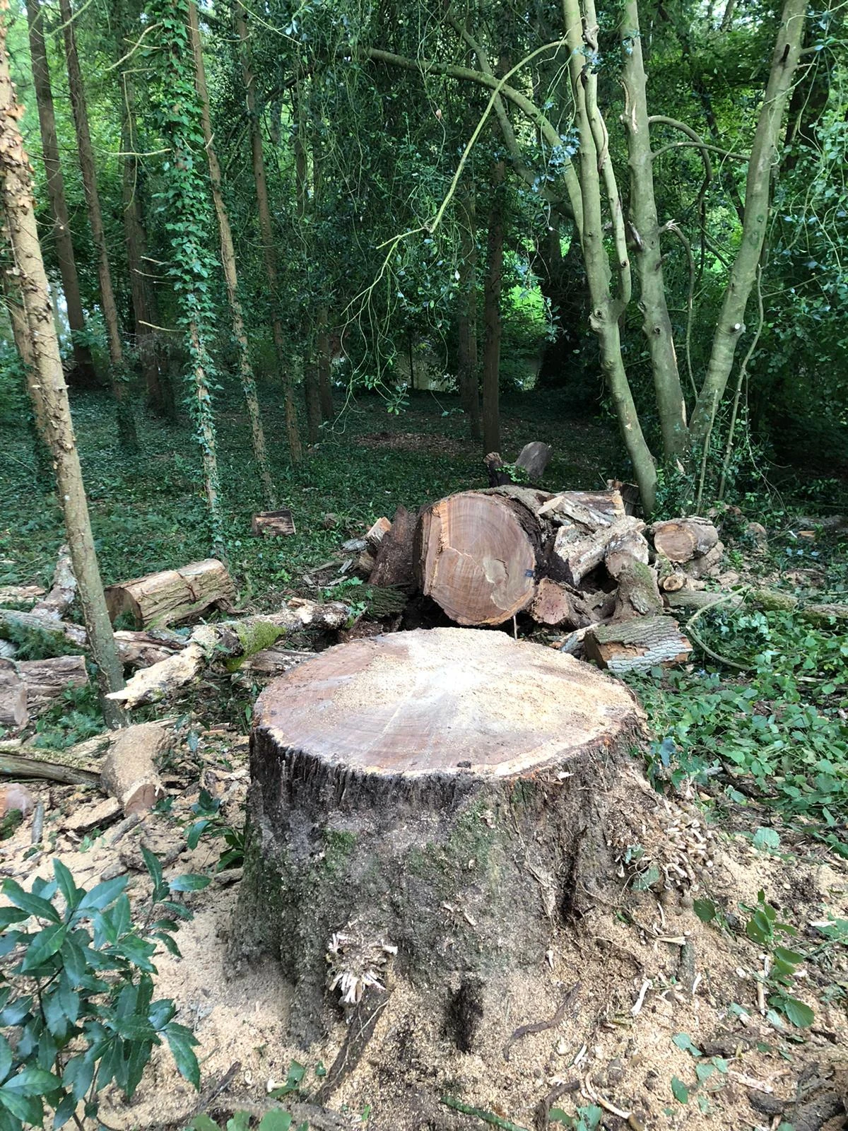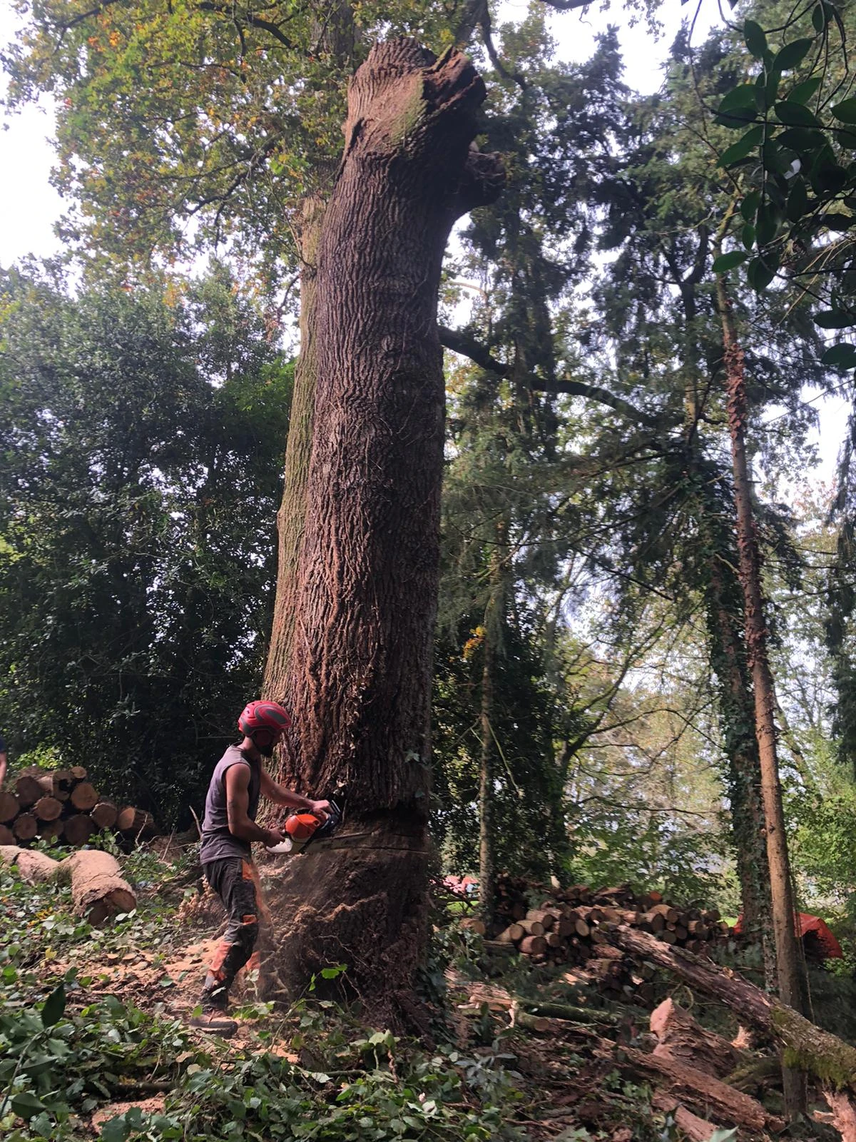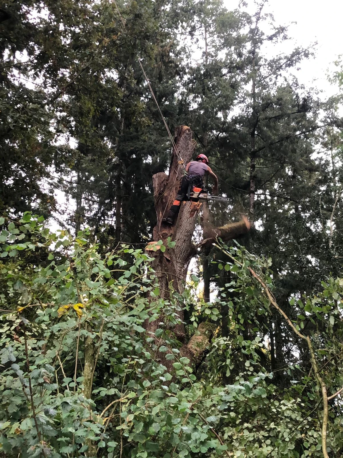 Situé à Jans dans un sous-bois avec de nombreux arbres autour, nous avons procédé à un démontage sur corde afin de faire tomber les différentes parties de l'arbre au fur et à mesure, pour ne pas endommager les autres essences autour de celui-ci.